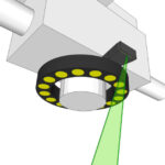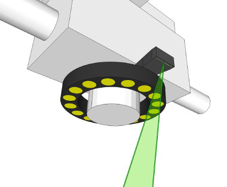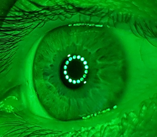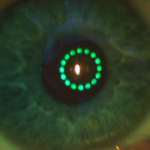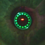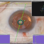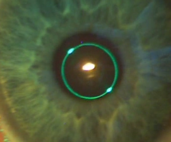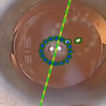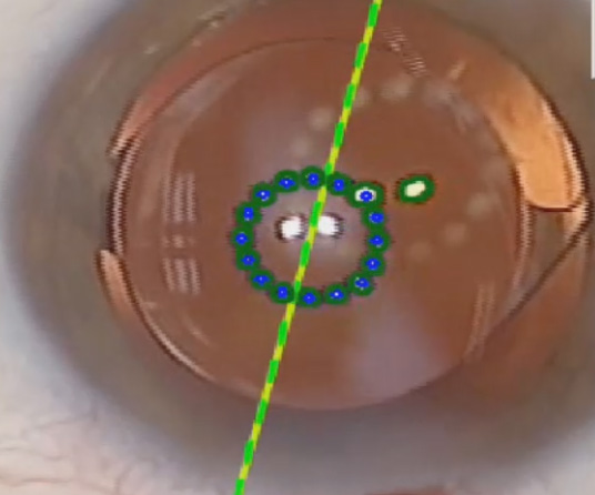 Eine der Methoden zur Anzeige der gemessenen Werte für die Astigmatismusachse basiert auf der Reflexion. Hierbei erzeugt ein zusätzlicher konzentrischer LED-Ring Hornhautreflexe, deren virtuelle Verbindungslinie die Zielausrichtung der torischen IOL vorgibt.