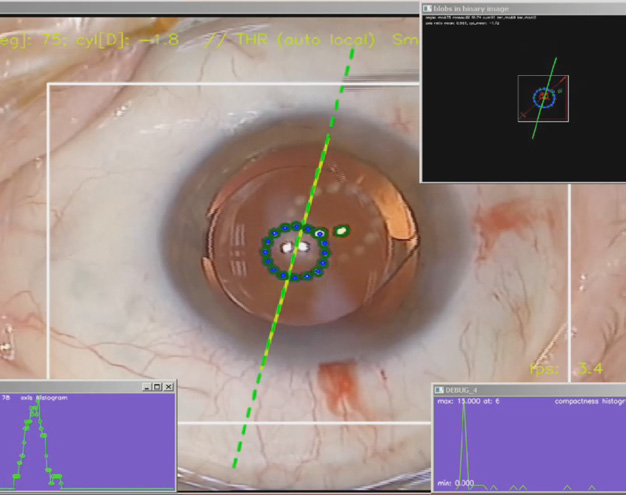 Bei der Operation stellt sich die Frage, wie die Achse des Astigmatismus im Vergleich zum Zeitpunkt der Diagnose ausgerichtet ist, da zwischen Diagnose und Operation zusätzliche Kopf- und Augendrehungen stattgefunden haben können. Diese Verdrehung muss berücksichtigt werden, um die Achse der torischen IOL korrekt einzustellen. Die meisten Chirurgen verwenden eine manuelle Technik, um die gewünschte Ausrichtung der Linse zu markieren. Moderne Systeme versuchen, dieses Problem mithilfe von Bildverarbeitung zu lösen, indem sie die Torsion zwischen aktuellen und Diagnosebildern einer Mikroskopkamera bestimmen.